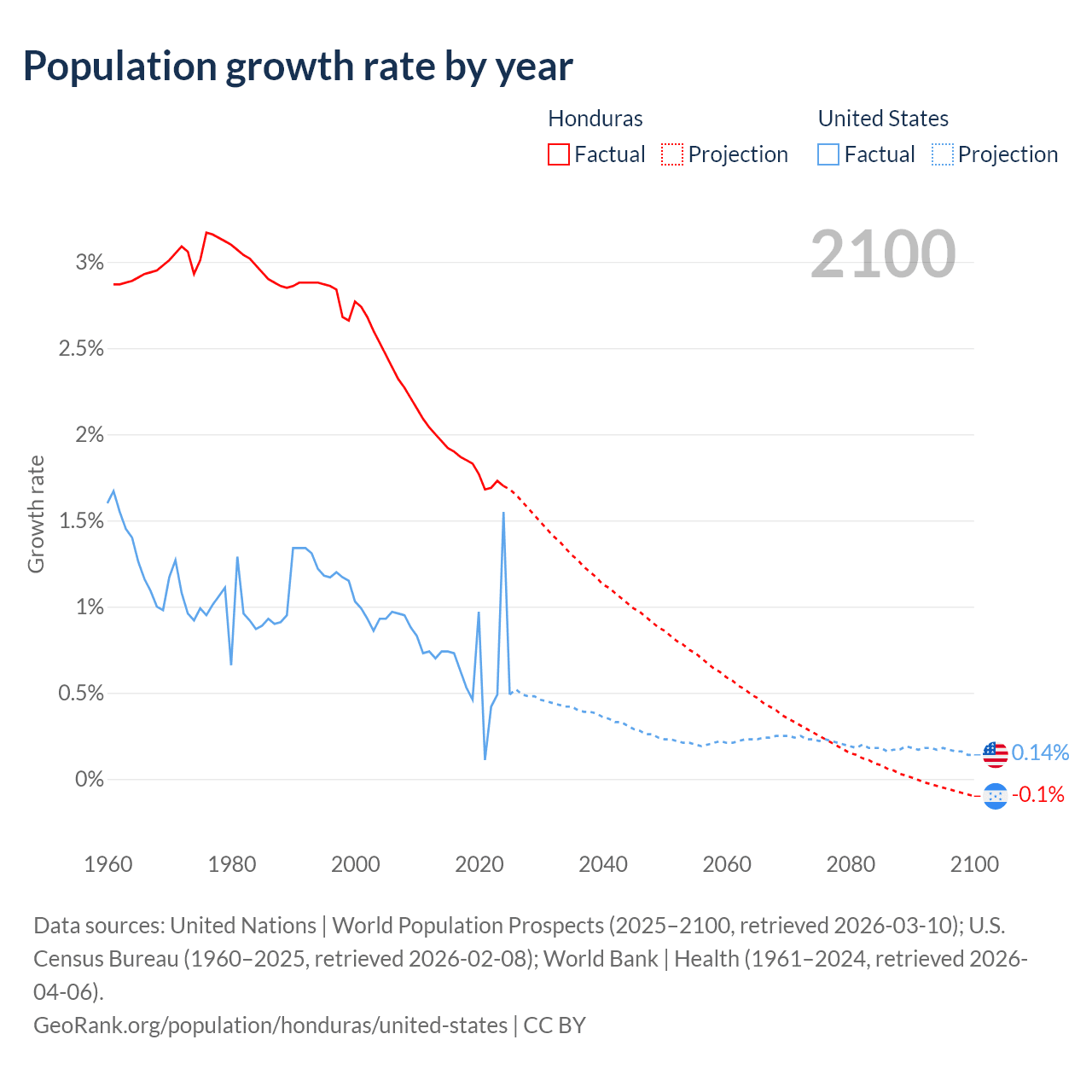 - For the last 10 years, Honduras has had an average growth rate of +1.81% per year vs +0.65% in the United States.