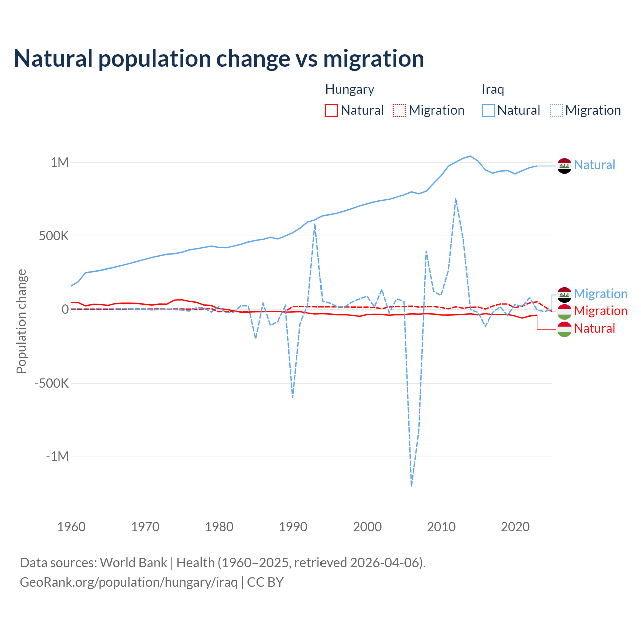 Over the last 10 years, 63.7% of the population change in Hungary is from natural causes (a loss of 412,838 people) and 36.3% is from migration (a gain of 234,837 people). In Iraq 99.2% is from natural causes (a gain of 9,598,842 people) and 0.76% is from migration (a loss of 73,050 people).