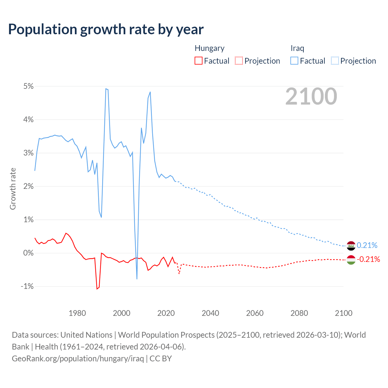 - For the last 10 years, Hungary has had an average growth rate of -0.29% per year vs +2.45% in Iraq.