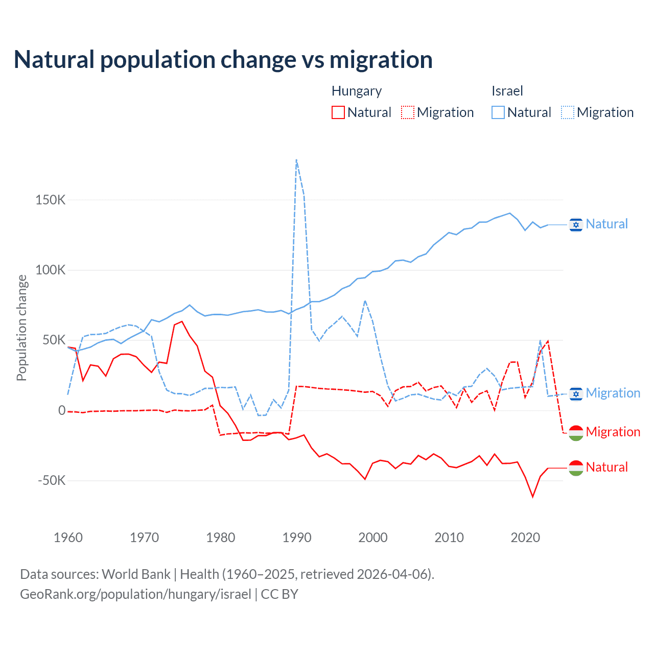 Over the last 10 years, 63.7% of the population change in Hungary is from natural causes (a loss of 412,838 people) and 36.3% is from migration (a gain of 234,837 people). In Israel 86% is from natural causes (a gain of 1,343,492 people) and 14% is from migration (a gain of 219,048 people).