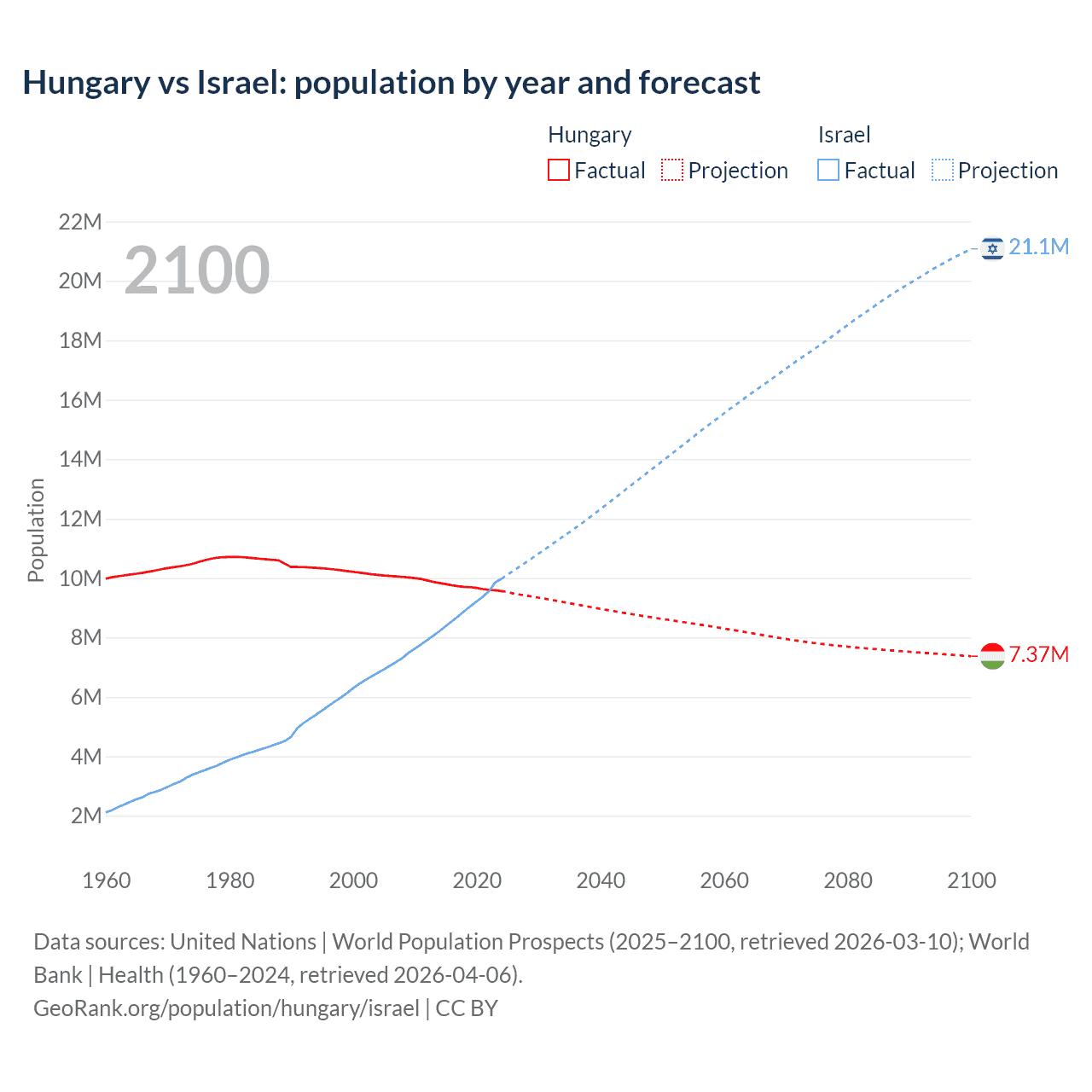 - Since 2006, the population of Hungary has decreased from 10.1M people to 9.48M (5.92% decline), while Israel has grown from 7.05M to 10.3M (45.9% growth).