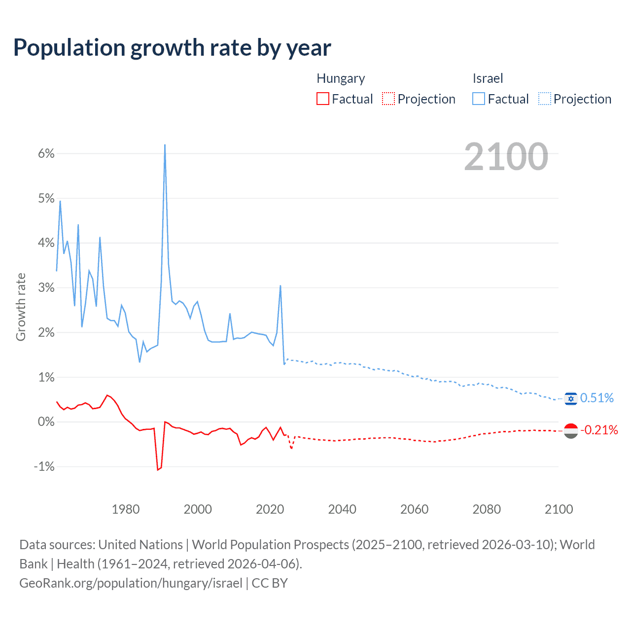 - For the last 10 years, Hungary has had an average growth rate of -0.29% per year vs +1.96% in Israel.