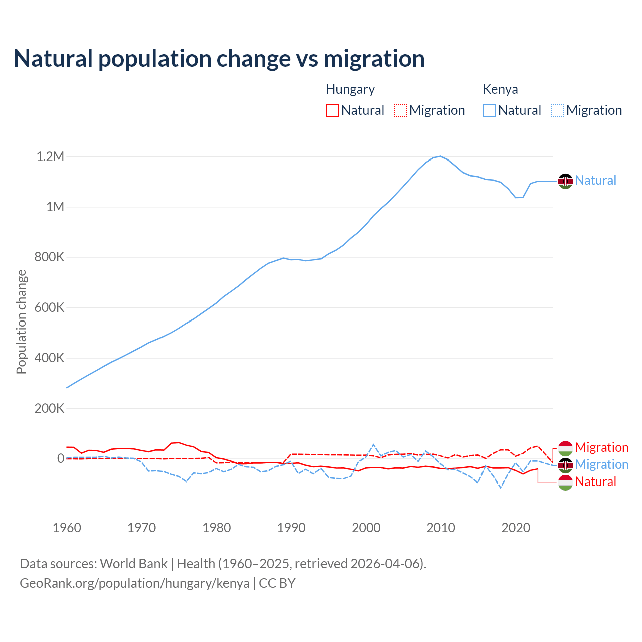 Over the last 10 years, 63.7% of the population change in Hungary is from natural causes (a loss of 412,838 people) and 36.3% is from migration (a gain of 234,837 people). In Kenya 95.3% is from natural causes (a gain of 10,892,362 people) and 4.67% is from migration (a loss of 533,876 people).