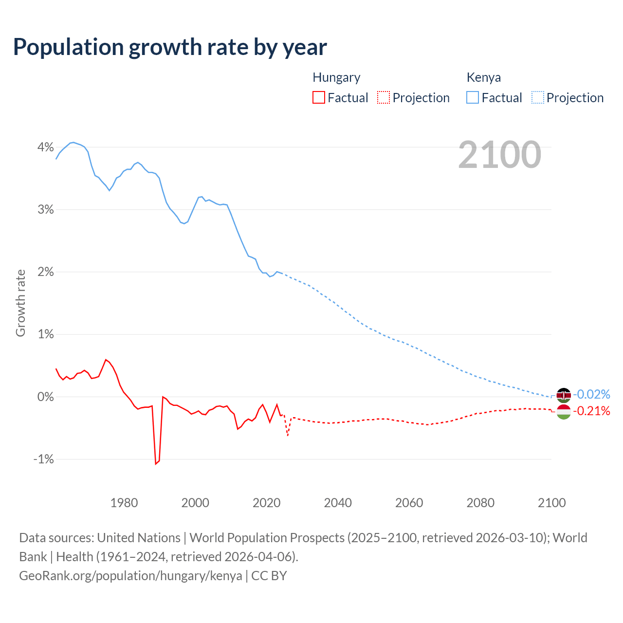- For the last 10 years, Hungary has had an average growth rate of -0.29% per year vs +2.08% in Kenya.