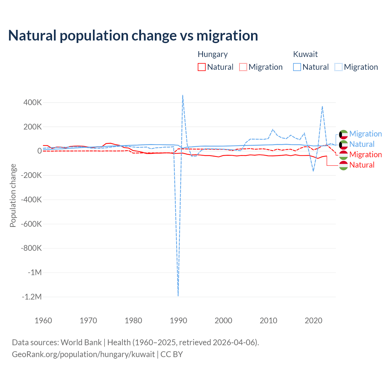Over the last 10 years, 63.7% of the population change in Hungary is from natural causes (a loss of 412,838 people) and 36.3% is from migration (a gain of 234,837 people). In Kuwait 35.8% is from natural causes (a gain of 470,645 people) and 64.2% is from migration (a gain of 845,142 people).