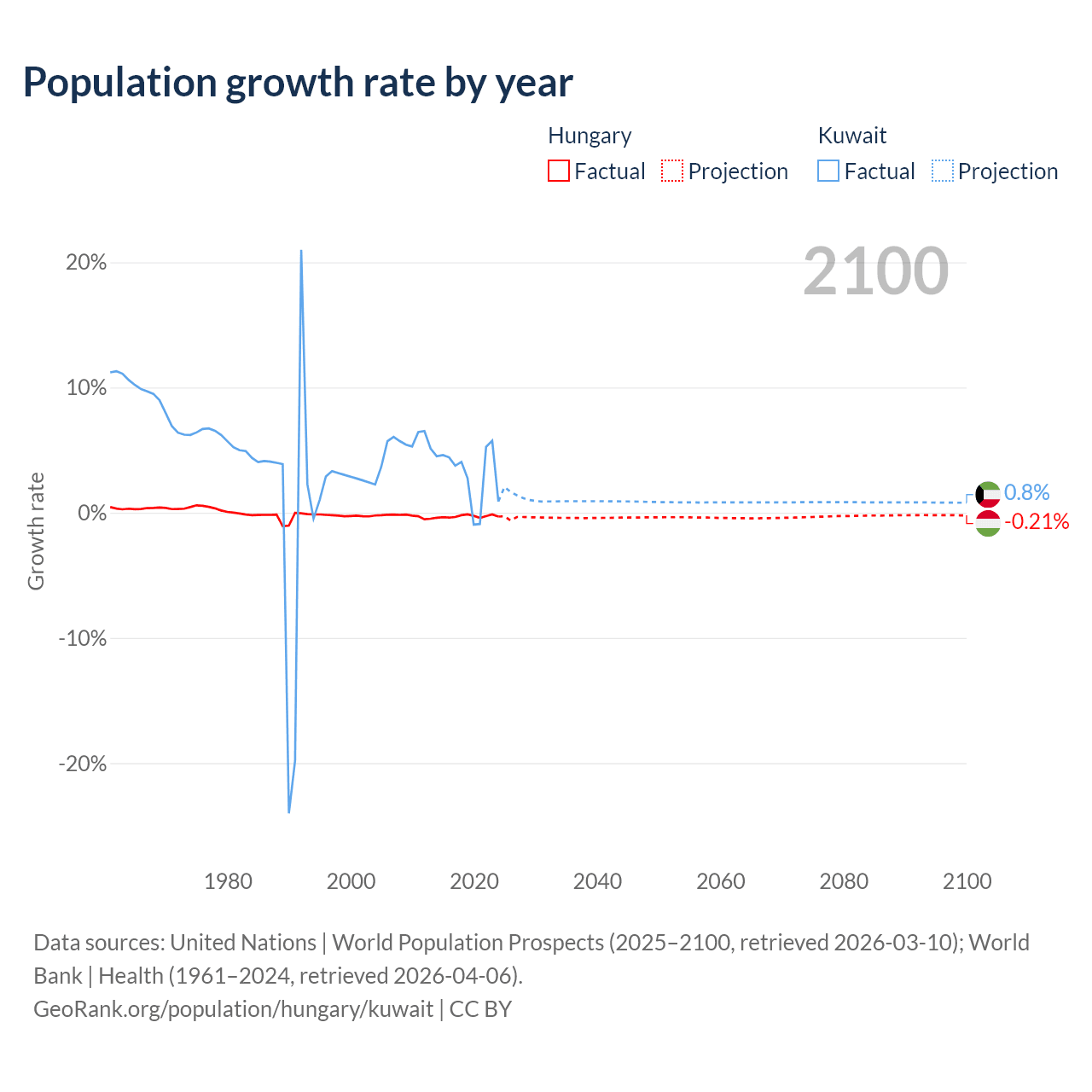 - For the last 10 years, Hungary has had an average growth rate of -0.29% per year vs +3.1% in Kuwait.