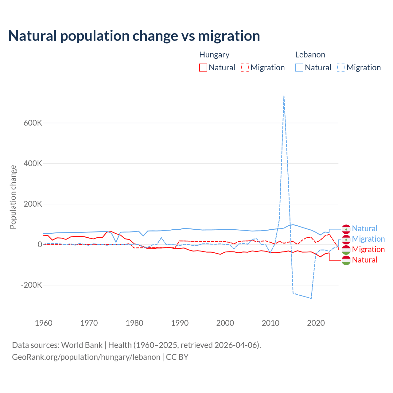 Over the last 10 years, 63.7% of the population change in Hungary is from natural causes (a loss of 412,838 people) and 36.3% is from migration (a gain of 234,837 people). In Lebanon 40.1% is from natural causes (a gain of 739,256 people) and 59.9% is from migration (a loss of 1,103,772 people).