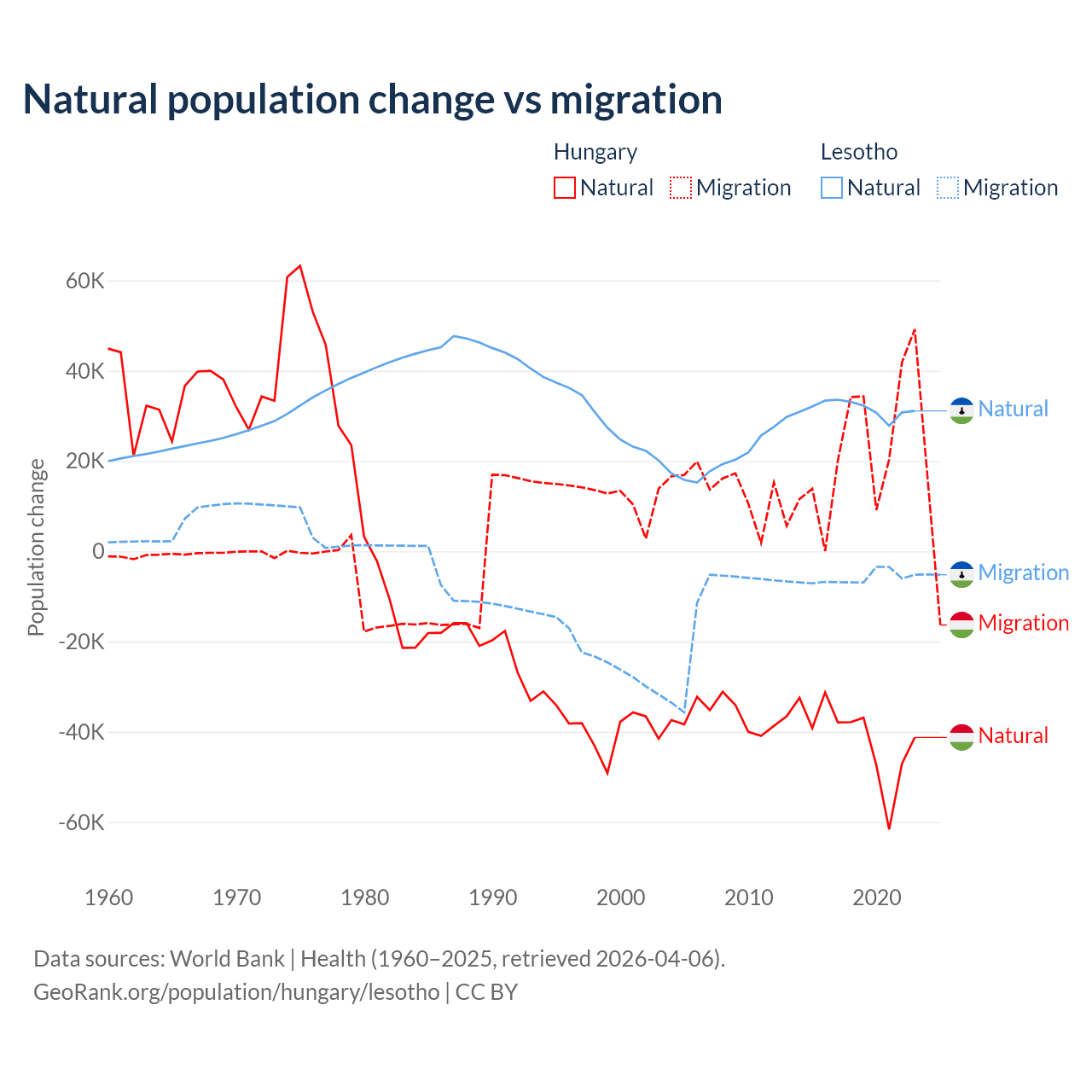 Over the last 10 years, 63.7% of the population change in Hungary is from natural causes (a loss of 412,838 people) and 36.3% is from migration (a gain of 234,837 people). In Lesotho 84.2% is from natural causes (a gain of 315,836 people) and 15.8% is from migration (a loss of 59,457 people).