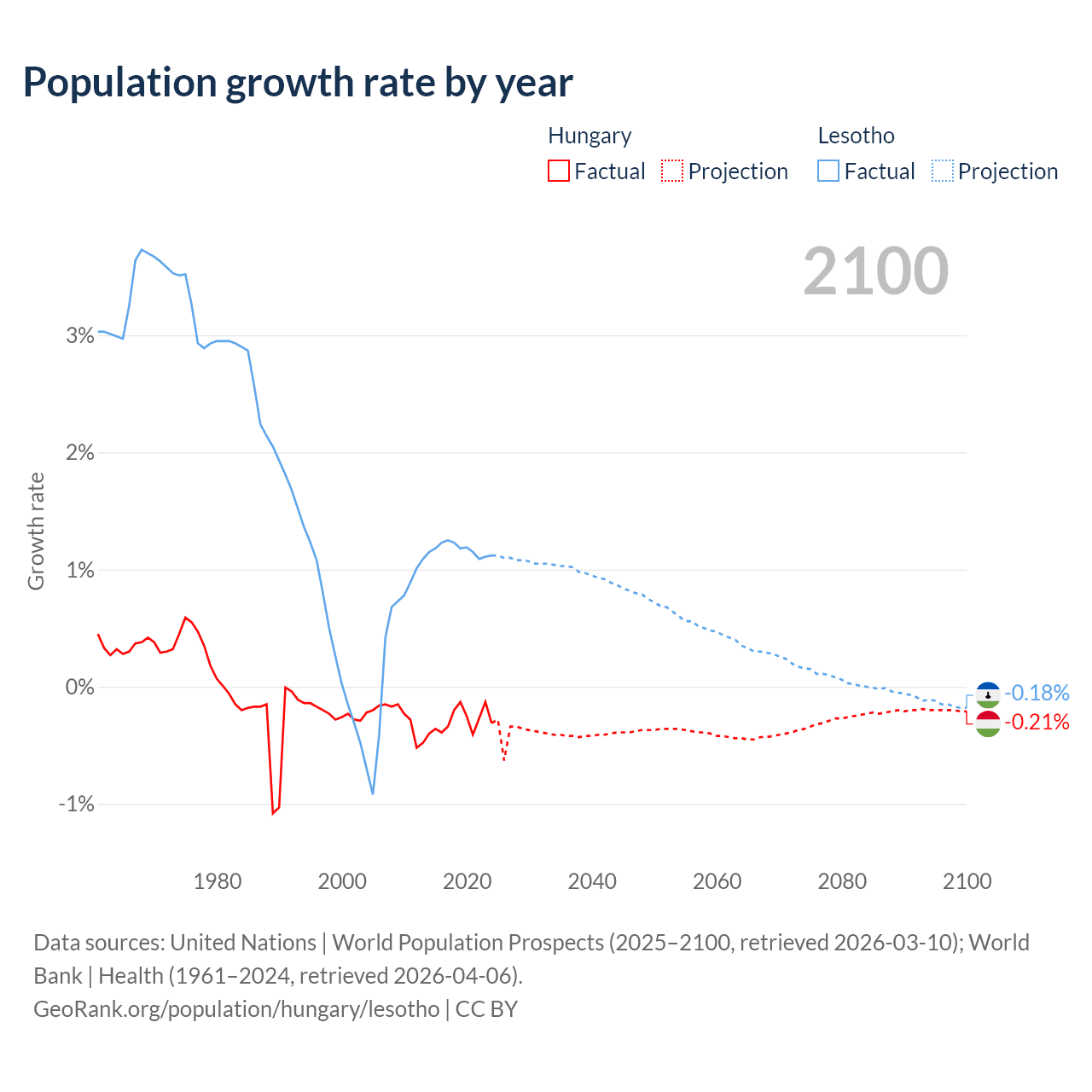 - For the last 10 years, Hungary has had an average growth rate of -0.29% per year vs +1.17% in Lesotho.
