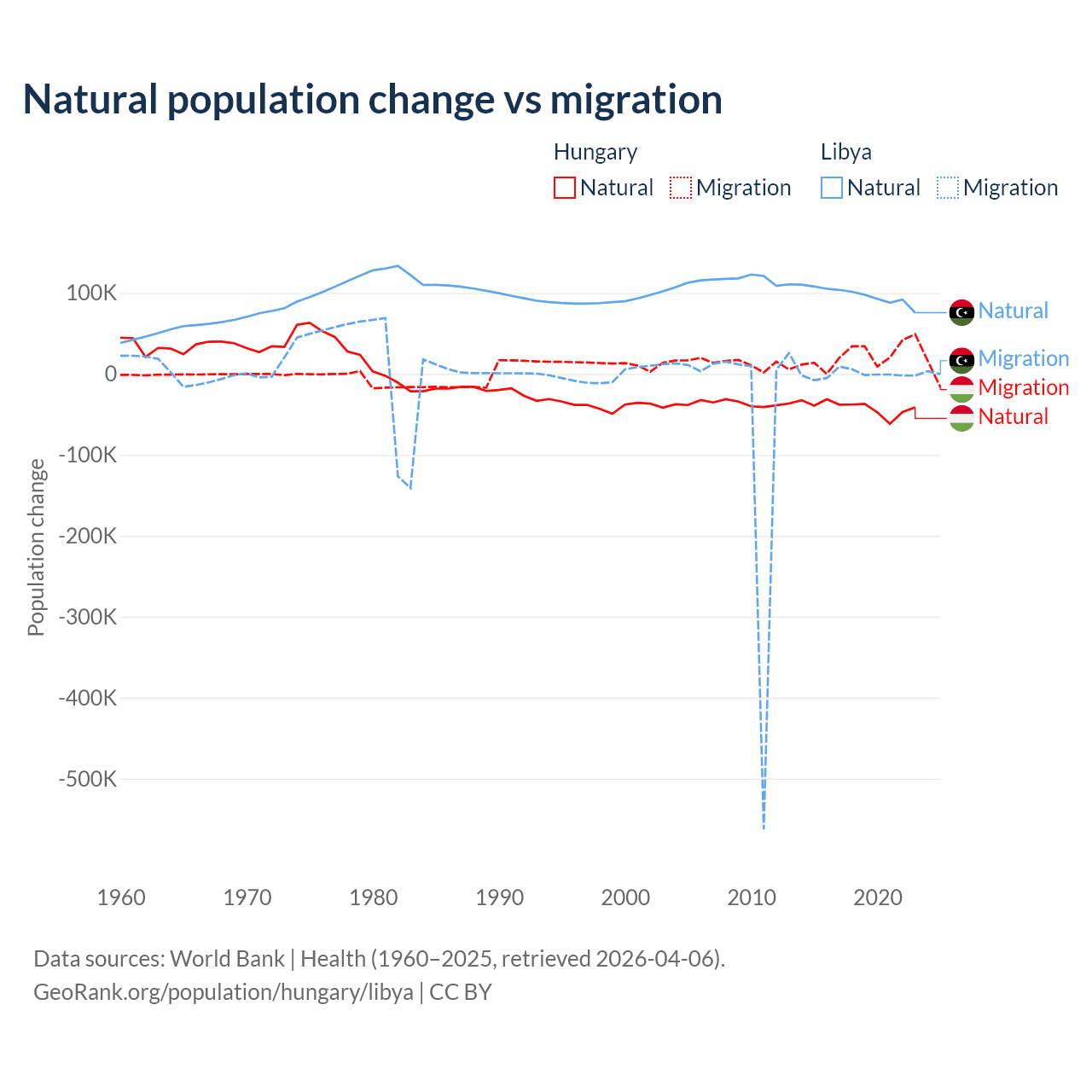 Over the last 10 years, 63.7% of the population change in Hungary is from natural causes (a loss of 412,838 people) and 36.3% is from migration (a gain of 234,837 people). In Libya 99.4% is from natural causes (a gain of 975,799 people) and 0.63% is from migration (a loss of 6,150 people).
