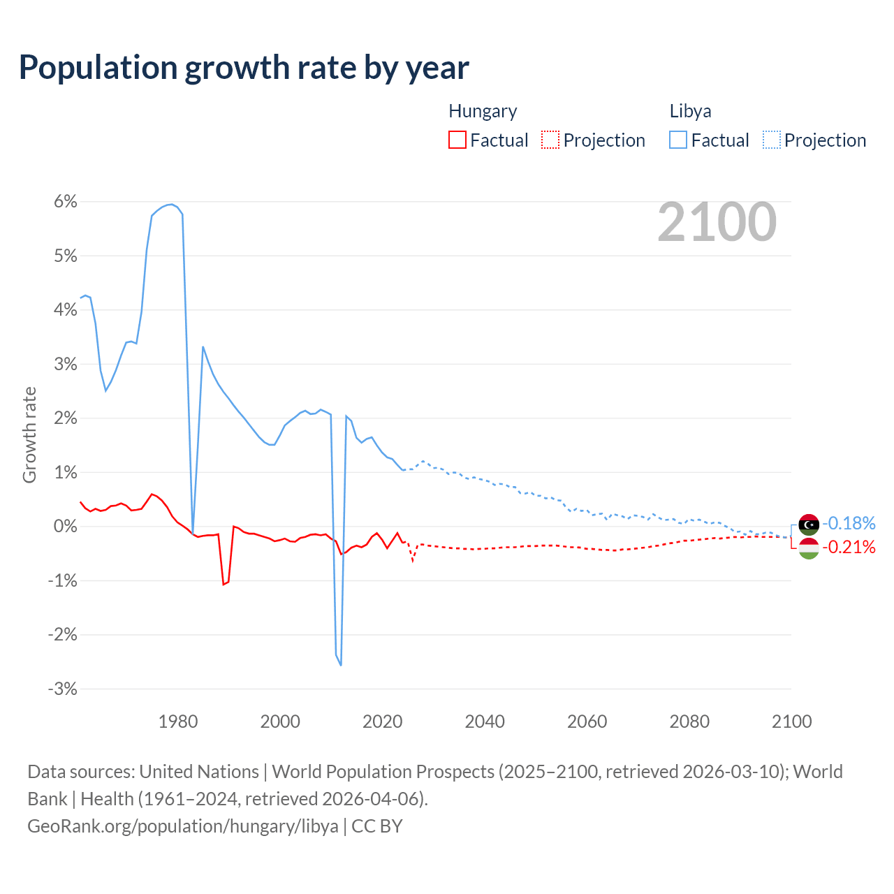 - For the last 10 years, Hungary has had an average growth rate of -0.29% per year vs +1.44% in Libya.