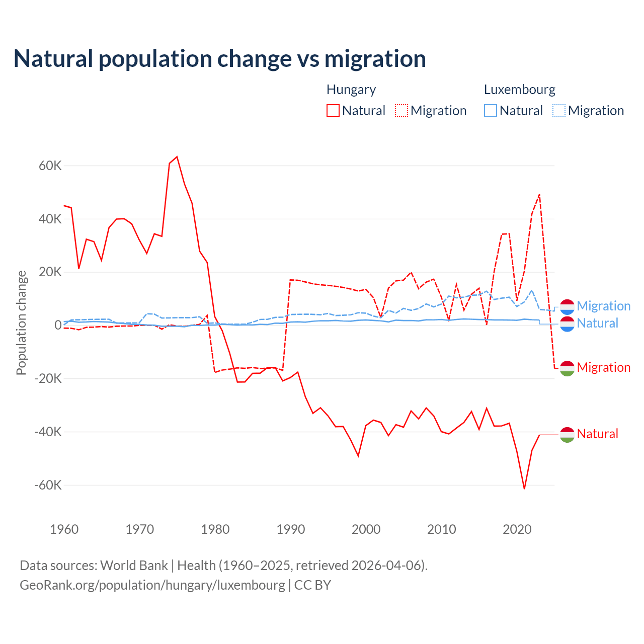 Over the last 10 years, 63.7% of the population change in Hungary is from natural causes (a loss of 412,838 people) and 36.3% is from migration (a gain of 234,837 people). In Luxembourg 16.8% is from natural causes (a gain of 20,287 people) and 83.2% is from migration (a gain of 100,435 people).