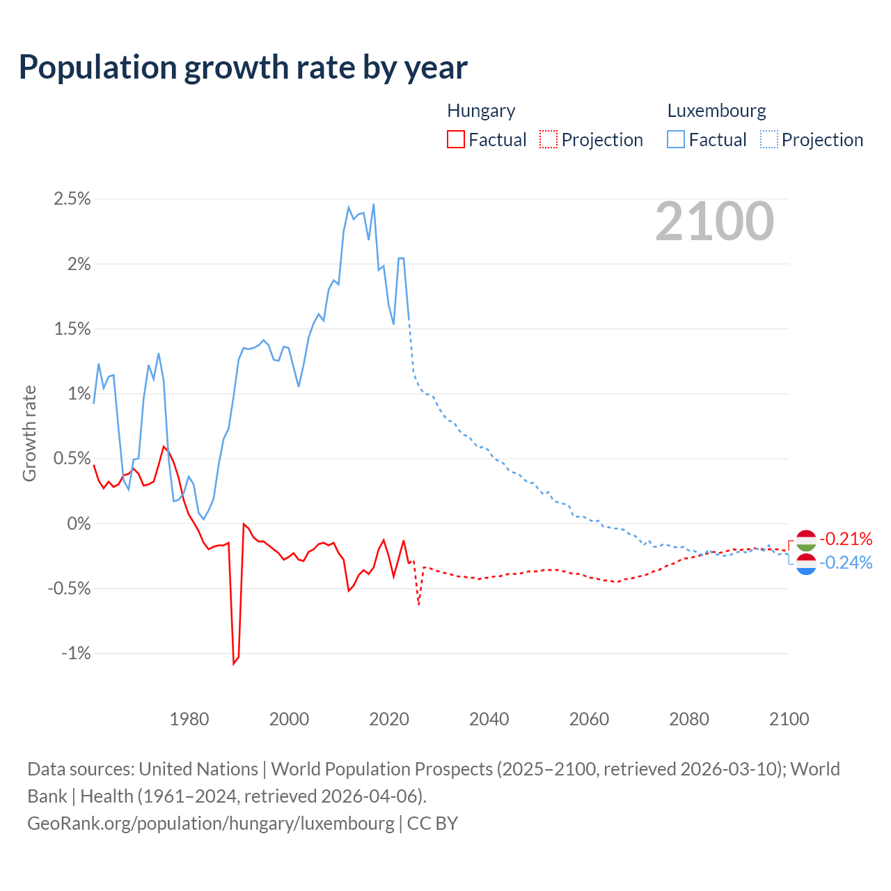 - For the last 10 years, Hungary has had an average growth rate of -0.29% per year vs +2.02% in Luxembourg.