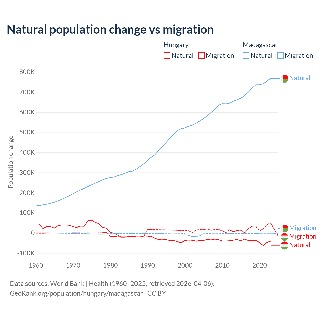 Over the last 10 years, 63.7% of the population change in Hungary is from natural causes (a loss of 412,838 people) and 36.3% is from migration (a gain of 234,837 people). In Madagascar 99.7% is from natural causes (a gain of 7,165,578 people) and 0.31% is from migration (a loss of 22,384 people).