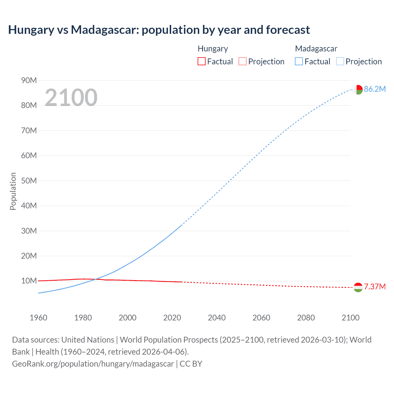 - Since 2006, the population of Hungary has decreased from 10.1M people to 9.48M (5.92% decline), while Madagascar has grown from 19.7M to 33.8M (71.1% growth).