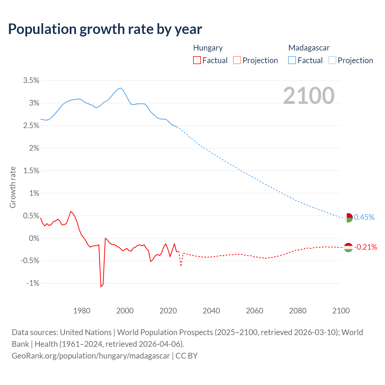 - For the last 10 years, Hungary has had an average growth rate of -0.29% per year vs +2.6% in Madagascar.