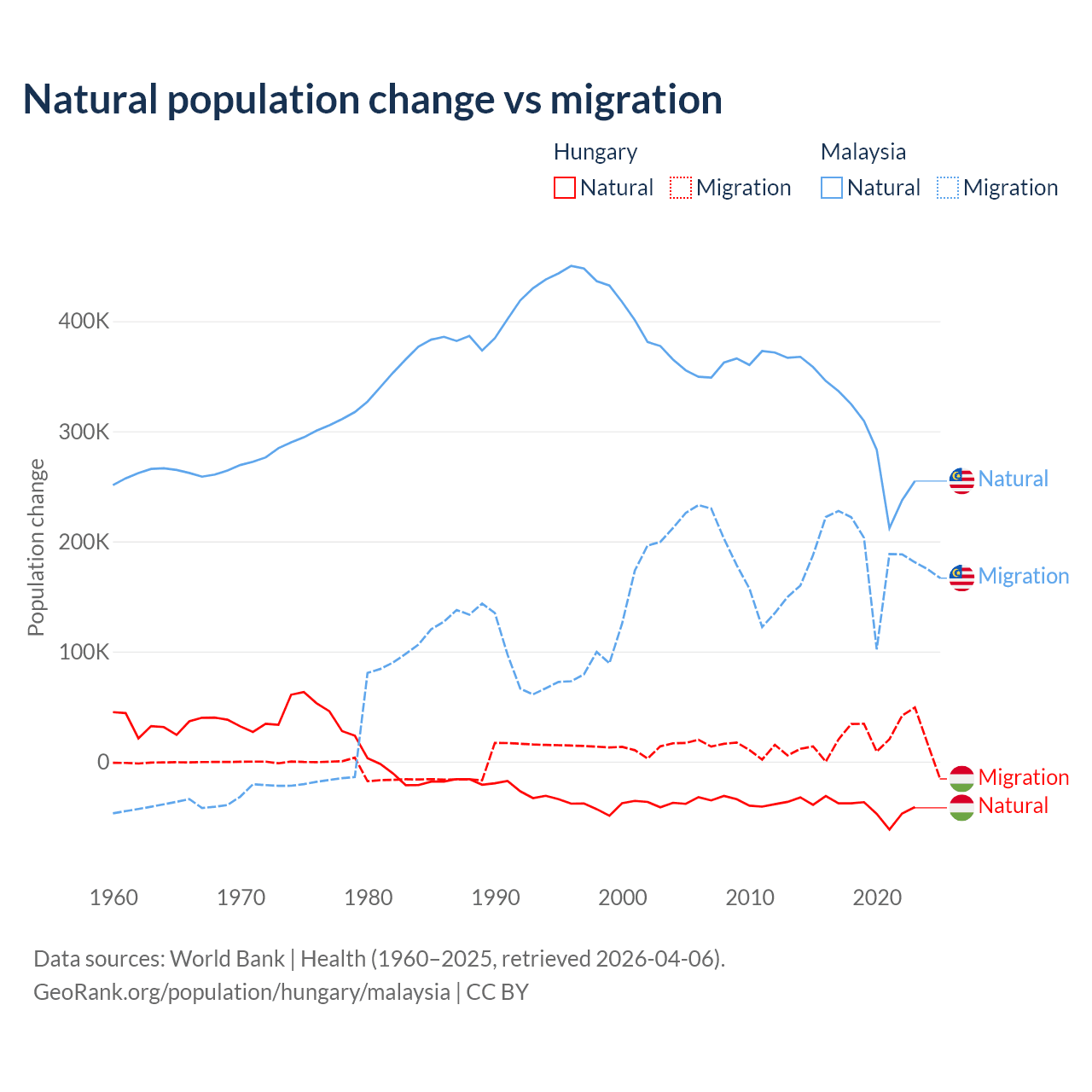 Over the last 10 years, 63.7% of the population change in Hungary is from natural causes (a loss of 412,838 people) and 36.3% is from migration (a gain of 234,837 people). In Malaysia 61.7% is from natural causes (a gain of 3,029,648 people) and 38.3% is from migration (a gain of 1,882,159 people).