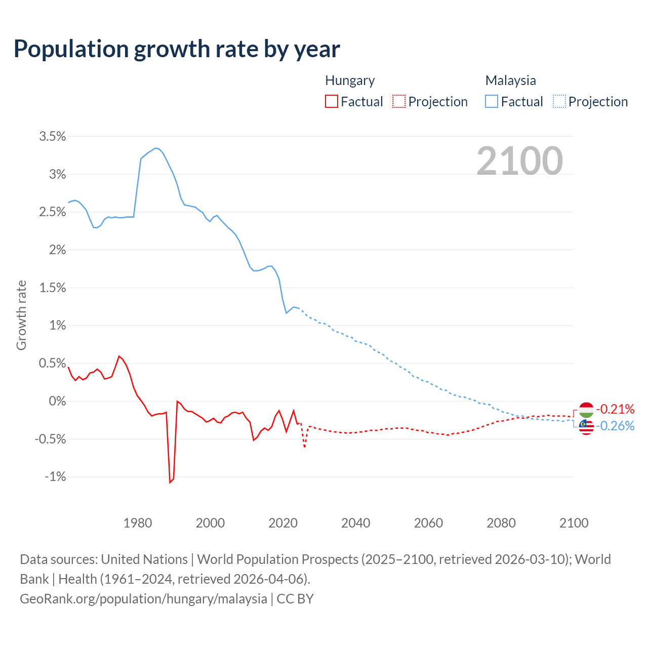 - For the last 10 years, Hungary has had an average growth rate of -0.29% per year vs +1.5% in Malaysia.