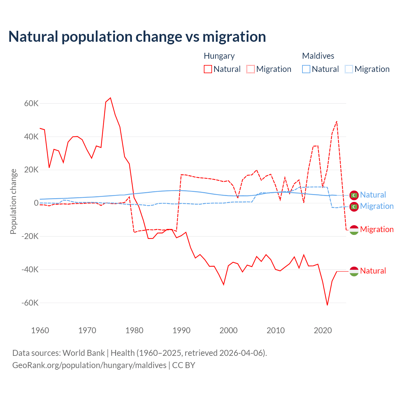 Over the last 10 years, 63.7% of the population change in Hungary is from natural causes (a loss of 412,838 people) and 36.3% is from migration (a gain of 234,837 people). In Maldives 42.7% is from natural causes (a gain of 51,342 people) and 57.3% is from migration (a gain of 68,788 people).