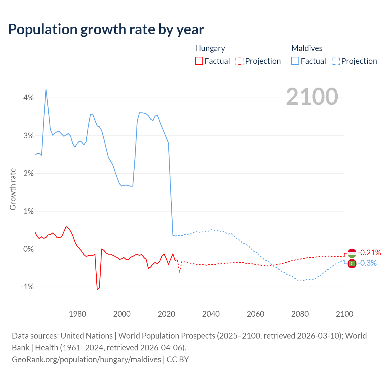 - For the last 10 years, Hungary has had an average growth rate of -0.29% per year vs +2.56% in Maldives.