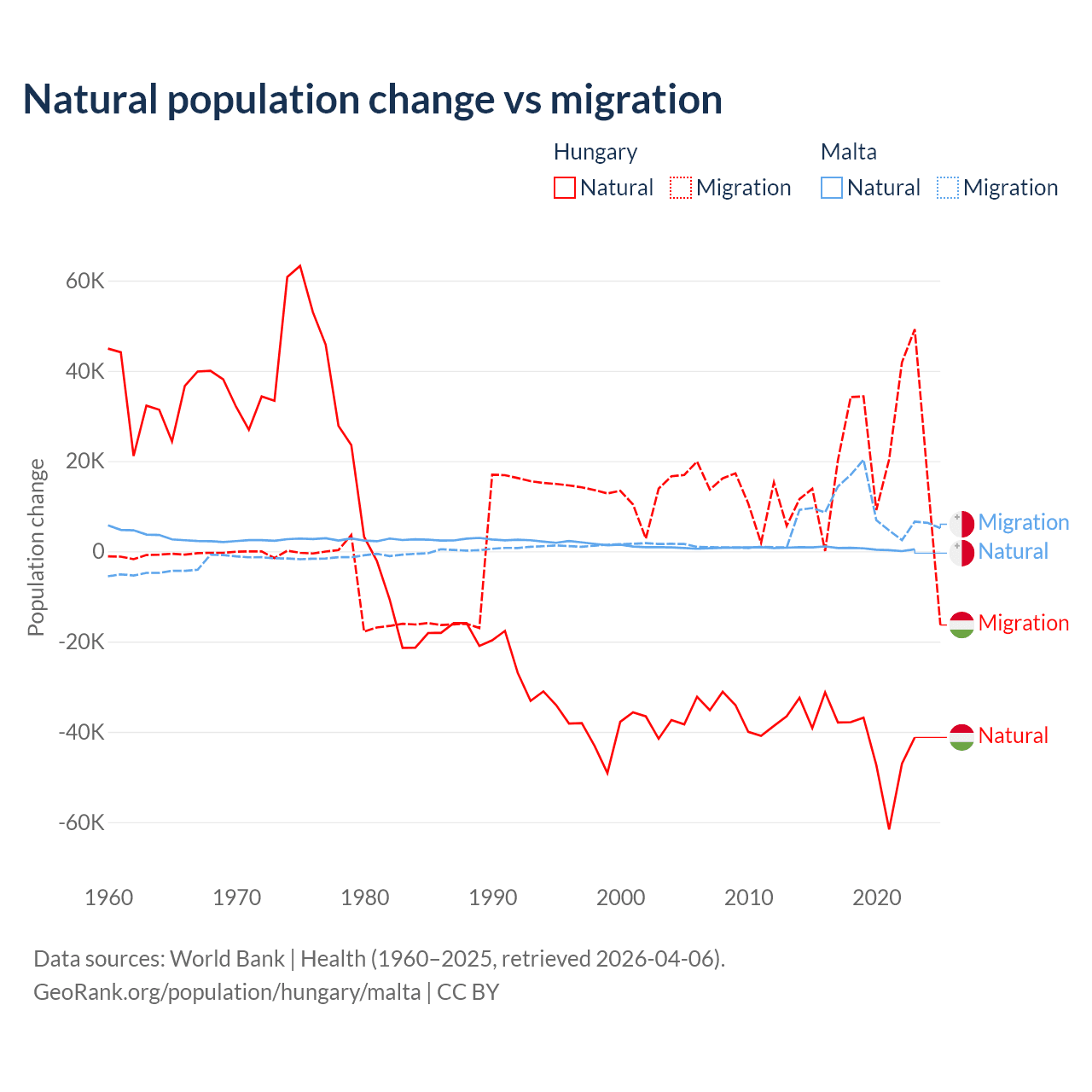 Over the last 10 years, 63.7% of the population change in Hungary is from natural causes (a loss of 412,838 people) and 36.3% is from migration (a gain of 234,837 people). In Malta 5.84% is from natural causes (a gain of 6,181 people) and 94.2% is from migration (a gain of 99,652 people).