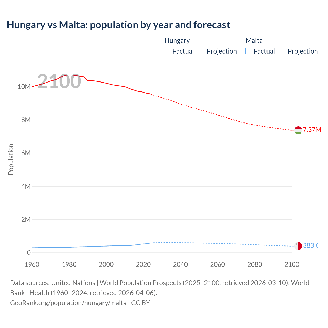 Hungary vs Malta: population by year and forecast