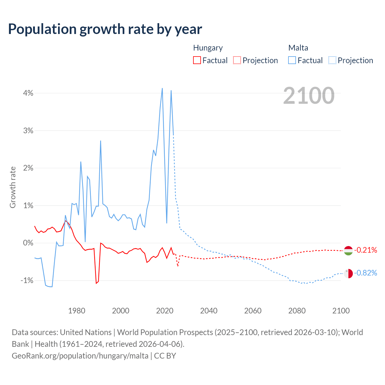 - For the last 10 years, Hungary has had an average growth rate of -0.29% per year vs +2.69% in Malta.
