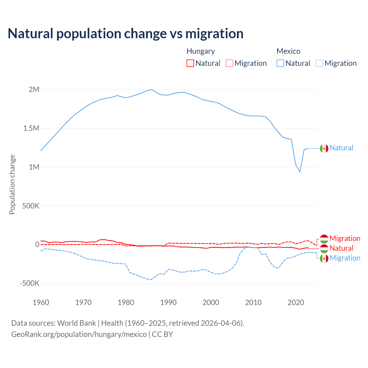 Over the last 10 years, 63.7% of the population change in Hungary is from natural causes (a loss of 412,838 people) and 36.3% is from migration (a gain of 234,837 people). In Mexico 87.5% is from natural causes (a gain of 13,080,136 people) and 12.5% is from migration (a loss of 1,876,544 people).