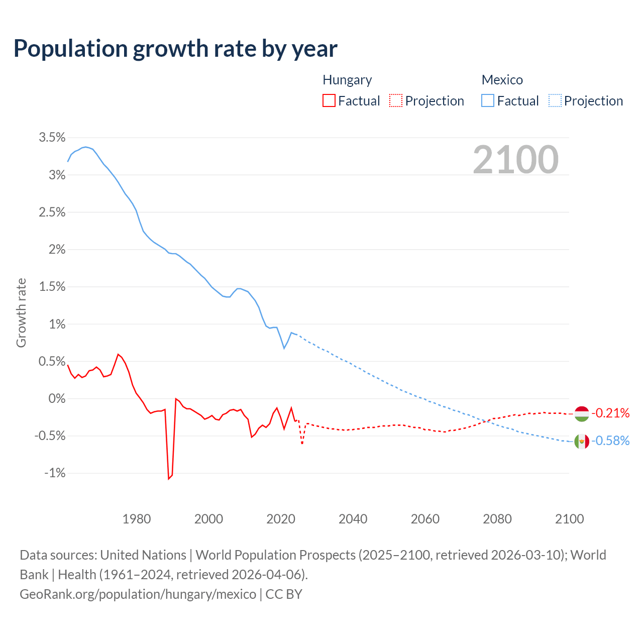 - For the last 10 years, Hungary has had an average growth rate of -0.29% per year vs +0.92% in Mexico.