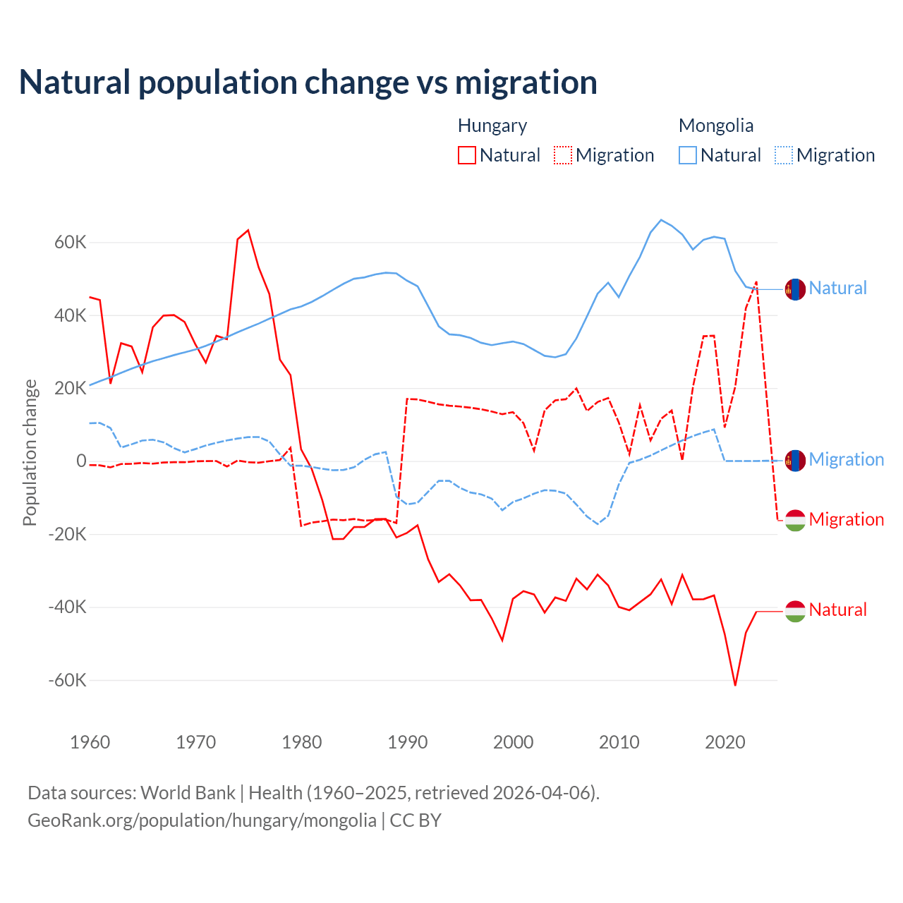 Over the last 10 years, 63.7% of the population change in Hungary is from natural causes (a loss of 412,838 people) and 36.3% is from migration (a gain of 234,837 people). In Mongolia 94.1% is from natural causes (a gain of 580,367 people) and 5.87% is from migration (a gain of 36,163 people).