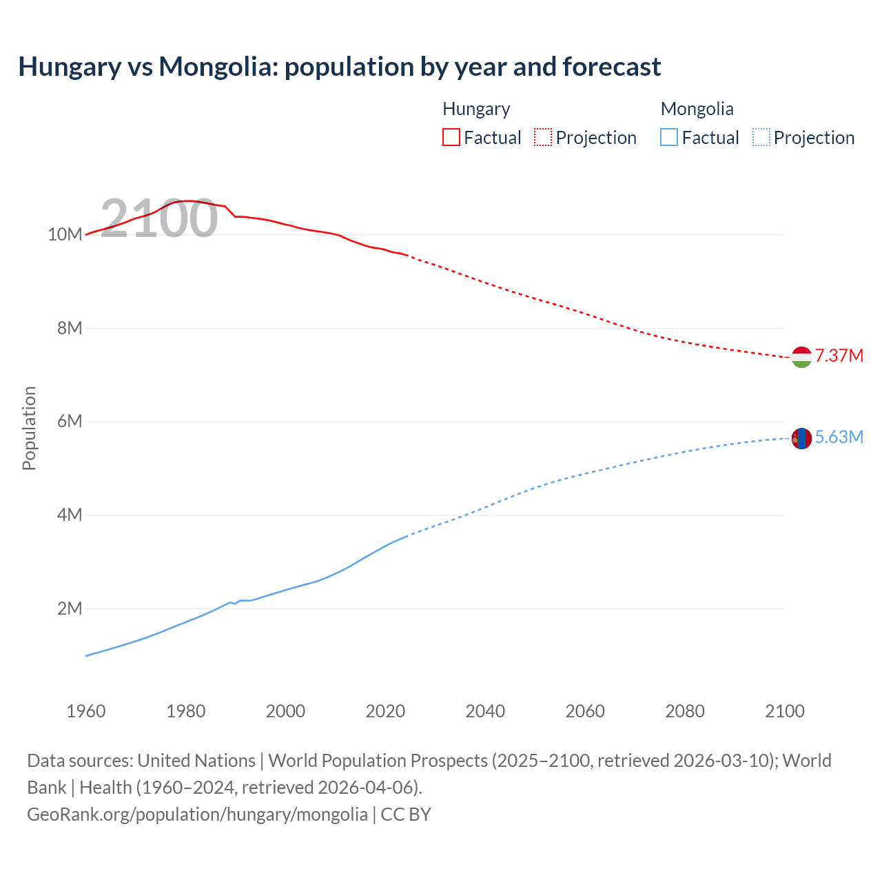 Hungary vs Mongolia: population by year and forecast