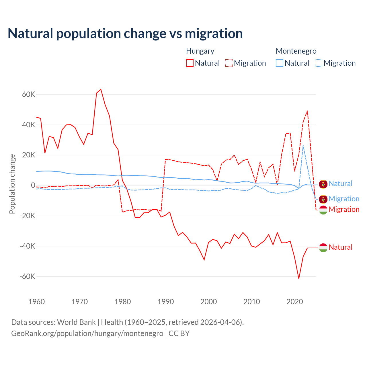 Over the last 10 years, 63.7% of the population change in Hungary is from natural causes (a loss of 412,838 people) and 36.3% is from migration (a gain of 234,837 people). In Montenegro 52.4% is from natural causes (a gain of 4,501 people) and 47.6% is from migration (a gain of 4,095 people).