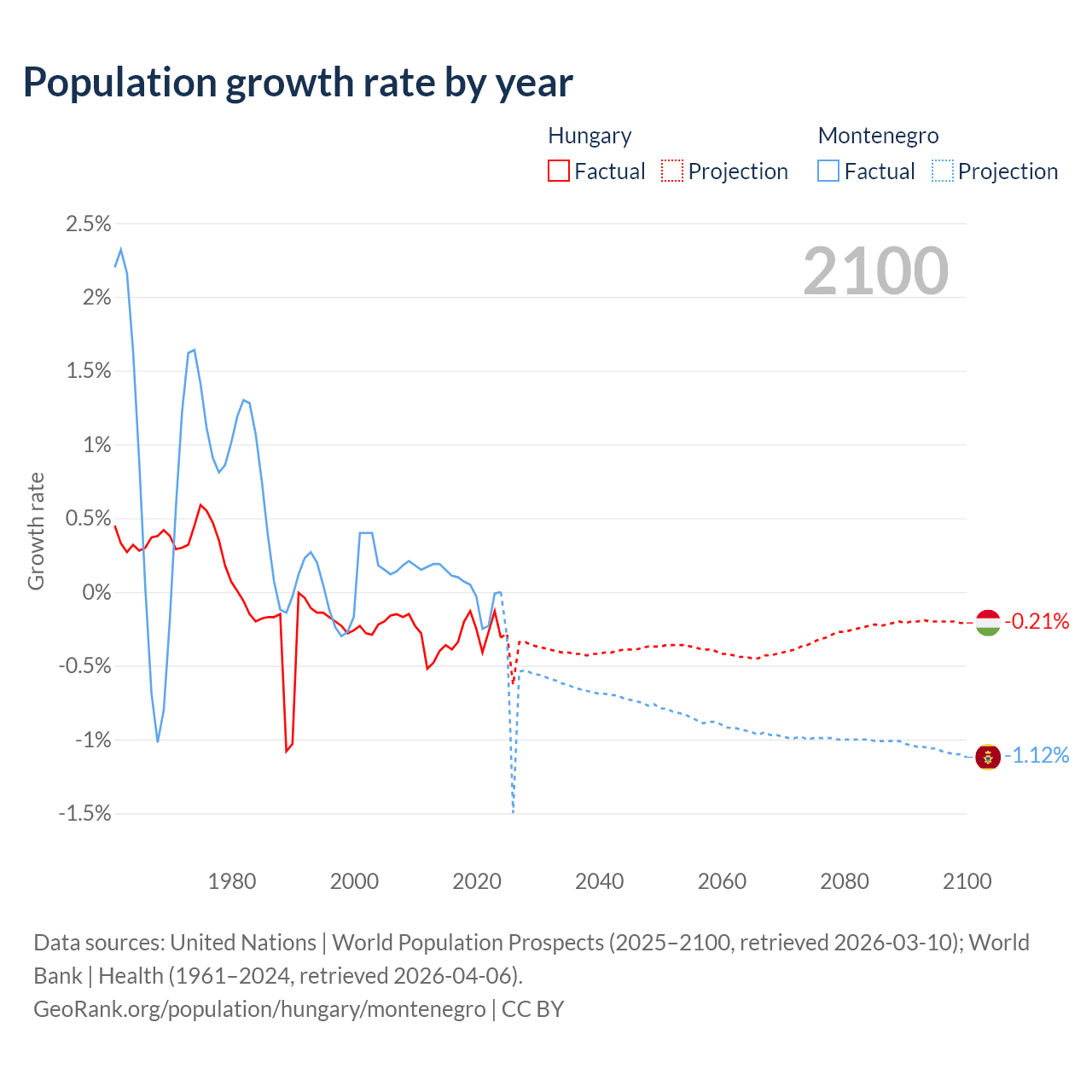 - For the last 10 years, Hungary has had an average growth rate of -0.29% per year vs +0.01% in Montenegro.