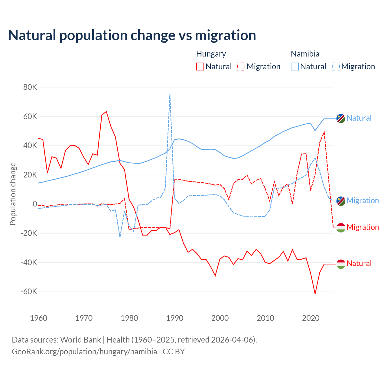 Over the last 10 years, 63.7% of the population change in Hungary is from natural causes (a loss of 412,838 people) and 36.3% is from migration (a gain of 234,837 people). In Namibia 74.3% is from natural causes (a gain of 532,532 people) and 25.7% is from migration (a gain of 183,837 people).