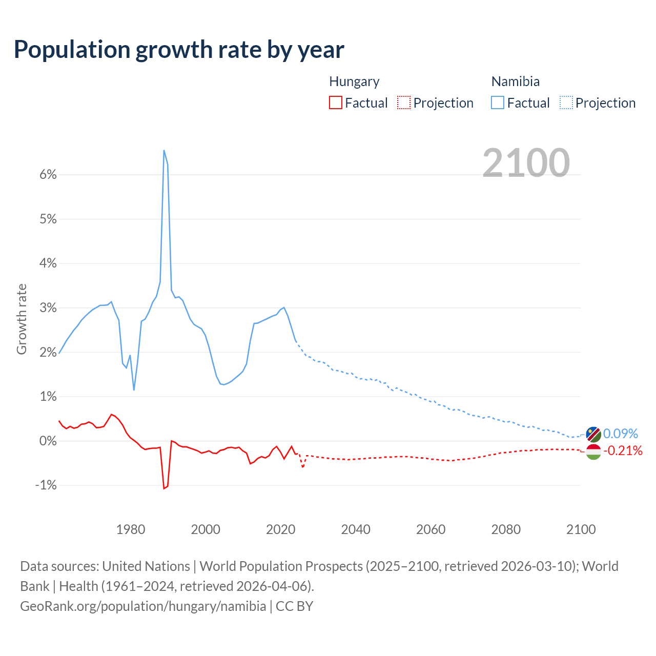 - For the last 10 years, Hungary has had an average growth rate of -0.29% per year vs +2.73% in Namibia.
