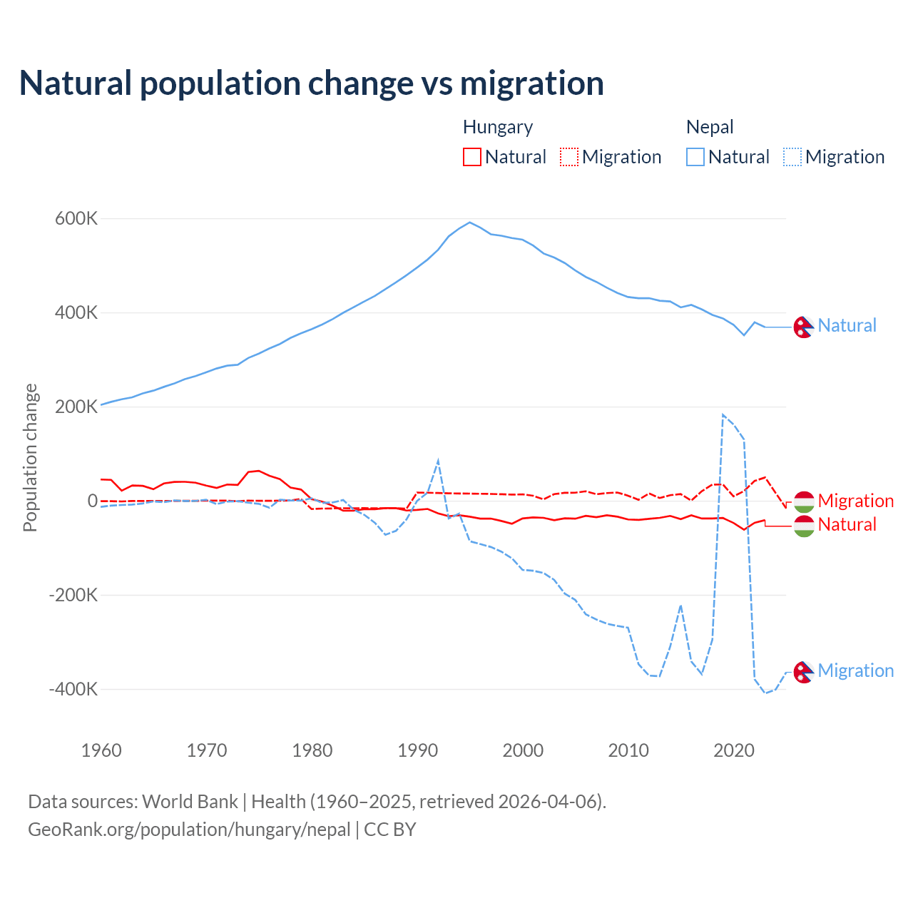 Over the last 10 years, 63.7% of the population change in Hungary is from natural causes (a loss of 412,838 people) and 36.3% is from migration (a gain of 234,837 people). In Nepal 67.9% is from natural causes (a gain of 3,909,749 people) and 32.1% is from migration (a loss of 1,851,664 people).