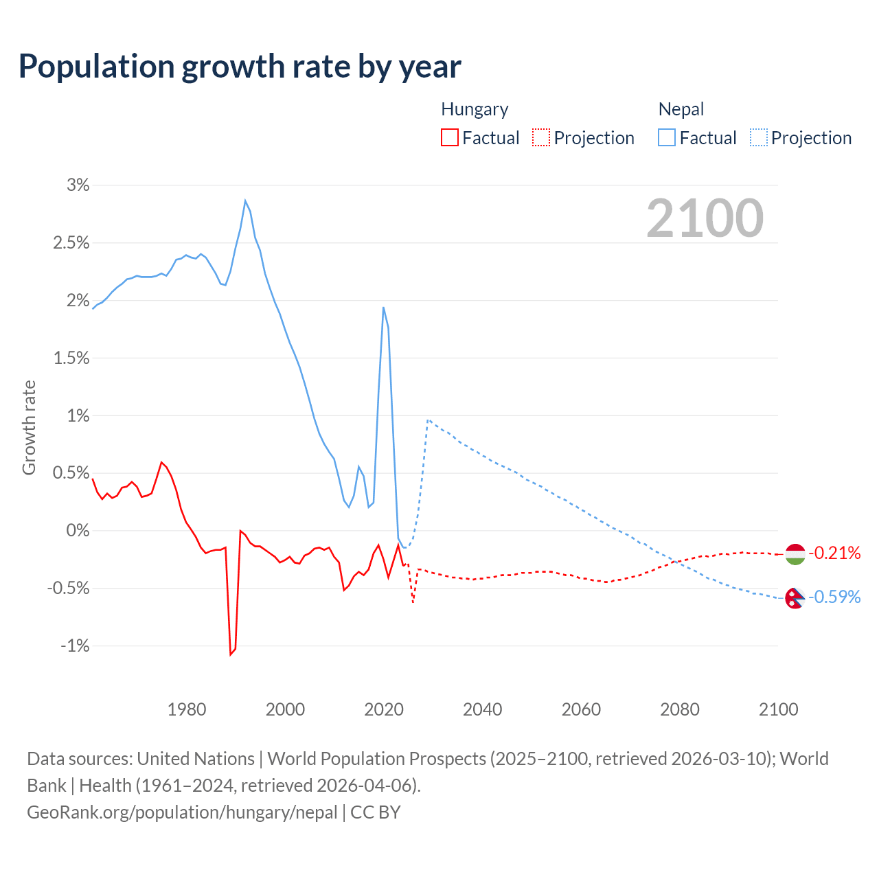 - For the last 10 years, Hungary has had an average growth rate of -0.29% per year vs +0.66% in Nepal.