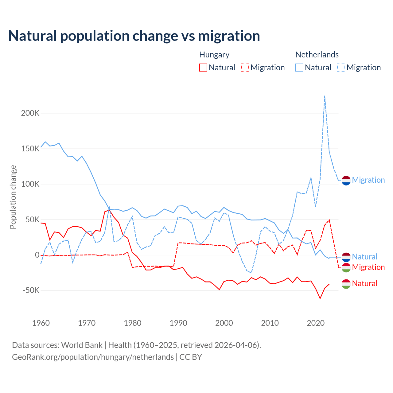 Over the last 10 years, 63.7% of the population change in Hungary is from natural causes (a loss of 412,838 people) and 36.3% is from migration (a gain of 234,837 people). In the Netherlands 11.8% is from natural causes (a gain of 134,554 people) and 88.2% is from migration (a gain of 1,006,495 people).