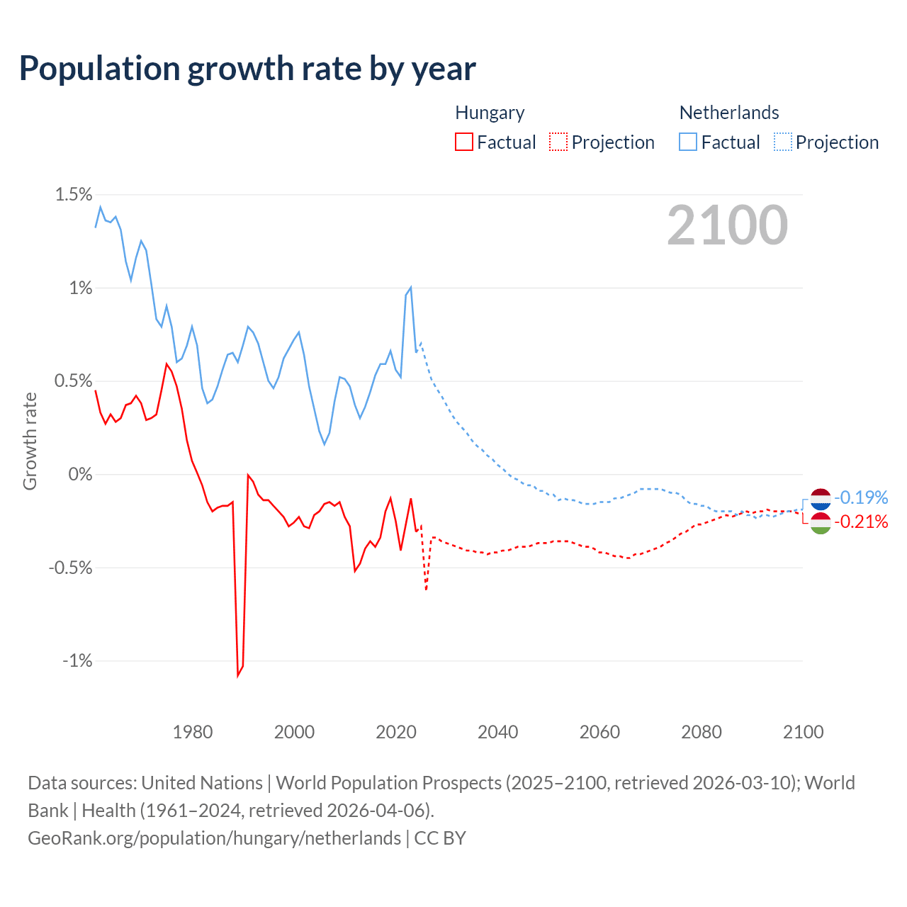- For the last 10 years, Hungary has had an average growth rate of -0.29% per year vs +0.62% in the Netherlands.