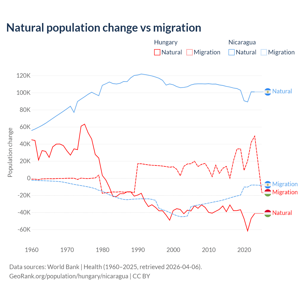 Over the last 10 years, 63.7% of the population change in Hungary is from natural causes (a loss of 412,838 people) and 36.3% is from migration (a gain of 234,837 people). In Nicaragua 85.5% is from natural causes (a gain of 1,017,084 people) and 14.5% is from migration (a loss of 172,078 people).