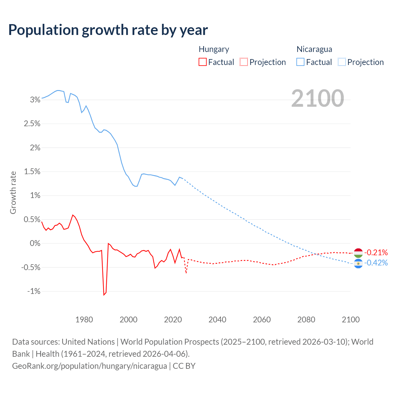 - For the last 10 years, Hungary has had an average growth rate of -0.29% per year vs +1.33% in Nicaragua.