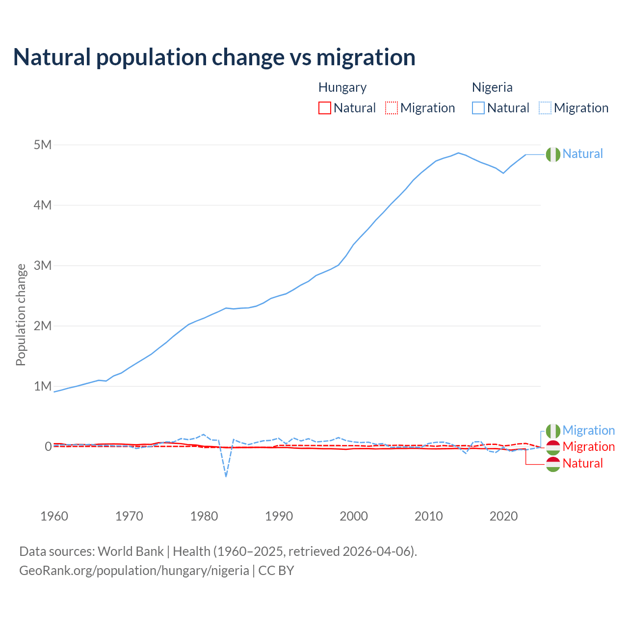 Over the last 10 years, 63.7% of the population change in Hungary is from natural causes (a loss of 412,838 people) and 36.3% is from migration (a gain of 234,837 people). In Nigeria 99.2% is from natural causes (a gain of 47,163,517 people) and 0.77% is from migration (a loss of 368,103 people).