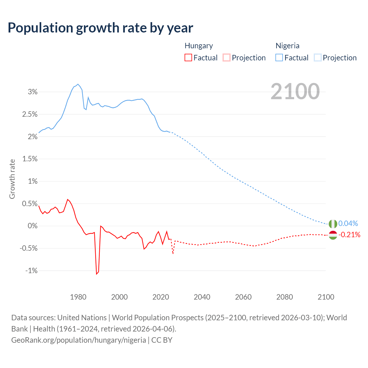 - For the last 10 years, Hungary has had an average growth rate of -0.29% per year vs +2.31% in Nigeria.