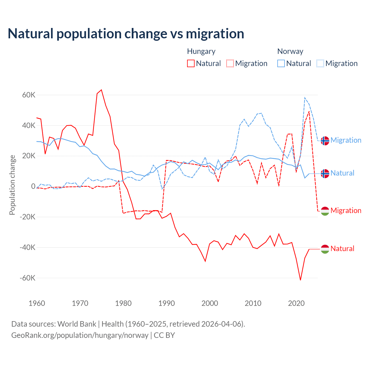 Over the last 10 years, 63.7% of the population change in Hungary is from natural causes (a loss of 412,838 people) and 36.3% is from migration (a gain of 234,837 people). In Norway 31.3% is from natural causes (a gain of 138,699 people) and 68.7% is from migration (a gain of 303,945 people).
