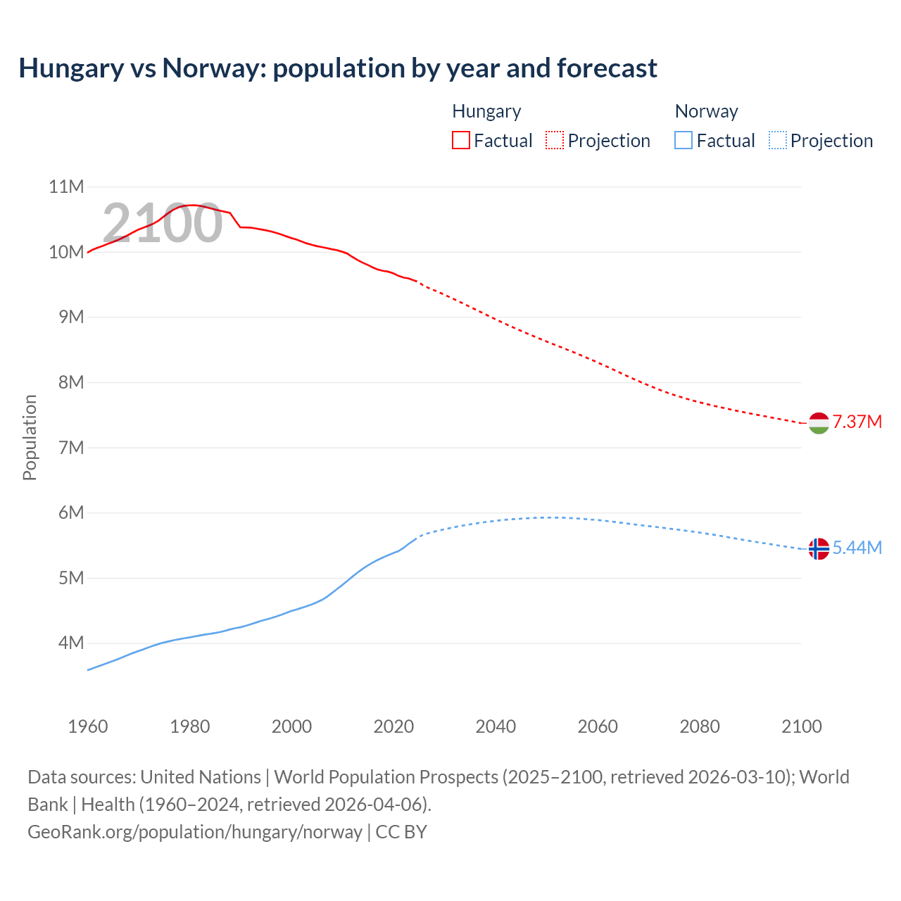 The latest officially reported population of Hungary was 9,562,065 in 2024 vs 5,572,279 people in Norway in 2024. In 2026, based on the adjusted UN estimation, the current Hungary's population is 9,475,525 people compared to 5,671,119 in Norway.