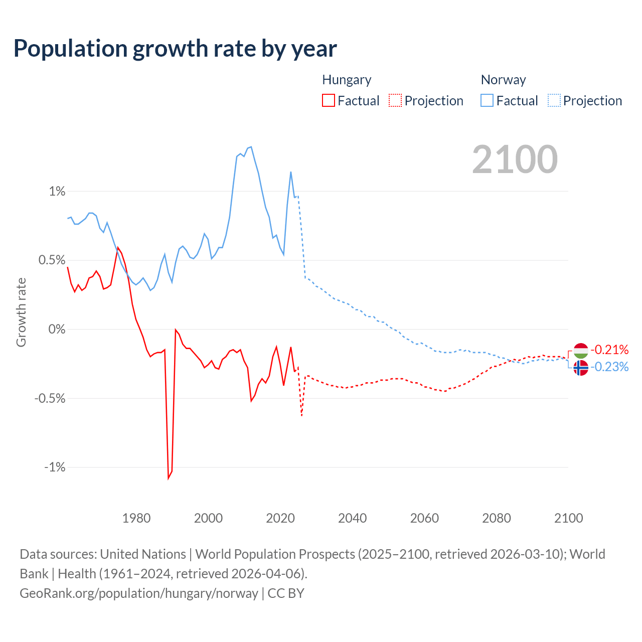 - For the last 10 years, Hungary has had an average growth rate of -0.29% per year vs +0.85% in Norway.