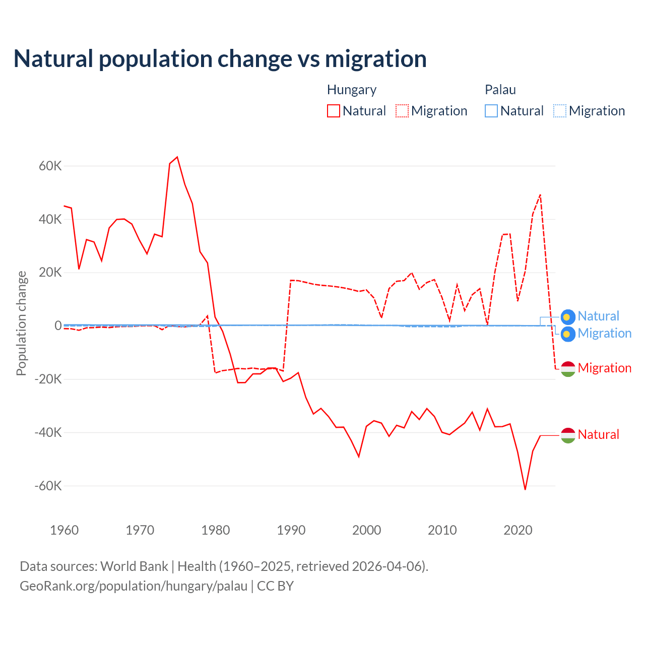 Over the last 10 years, 63.7% of the population change in Hungary is from natural causes (a loss of 412,838 people) and 36.3% is from migration (a gain of 234,837 people). In Palau 53.8% is from natural causes (a gain of 264 people) and 46.2% is from migration (a loss of 227 people).