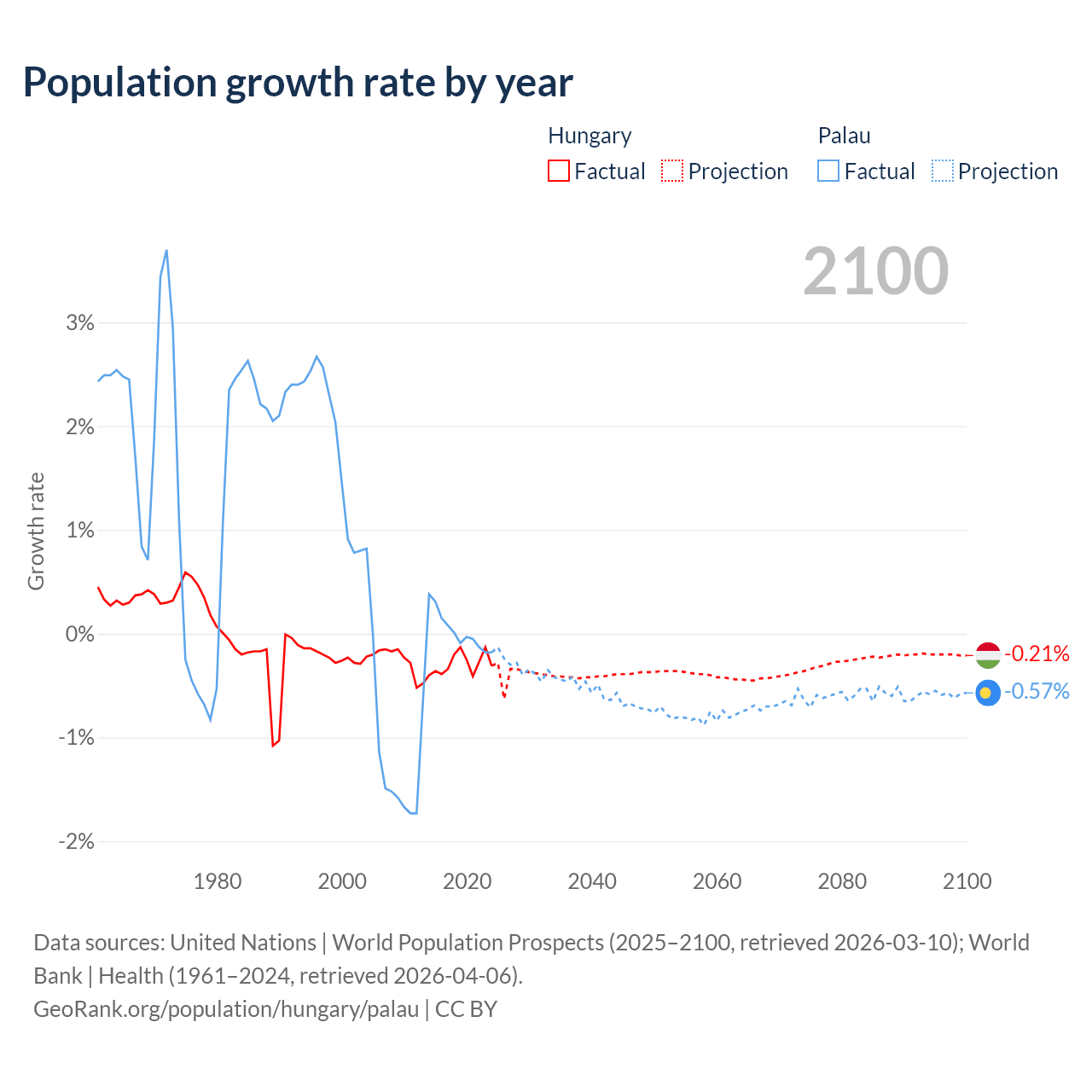 - For the last 10 years, Hungary has had an average growth rate of -0.29% per year vs +0.02% in Palau.