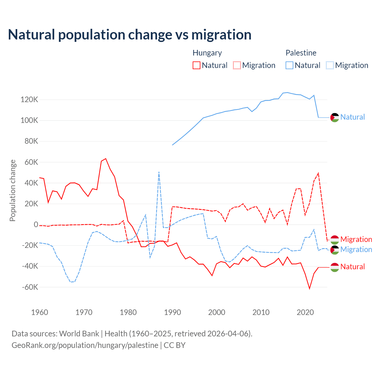 Over the last 10 years, 63.7% of the population change in Hungary is from natural causes (a loss of 412,838 people) and 36.3% is from migration (a gain of 234,837 people). In Palestine 85.7% is from natural causes (a gain of 1,218,010 people) and 14.3% is from migration (a loss of 202,820 people).