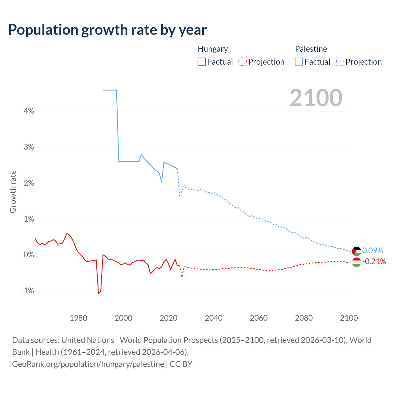 - For the last 10 years, Hungary has had an average growth rate of -0.29% per year vs +2.4% in Palestine.